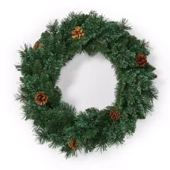 Noble House 24 In. Green Battery Operated Pre-Lit Warm White LED Mixed Pine Artificial Christmas Wreath With Pine Cones