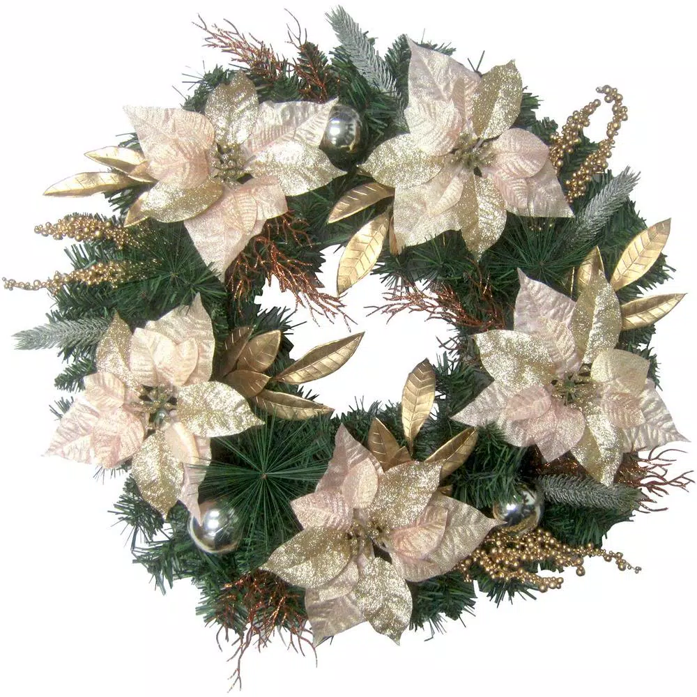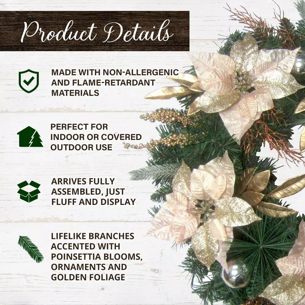 - Designer finishes: handcrafted green pine wreath trimmed with glamorous blush and festive gold tone faux poinsettia blooms, shatterproof ornaments, berries, and leaves, suitable for indoor or covered outdoor use