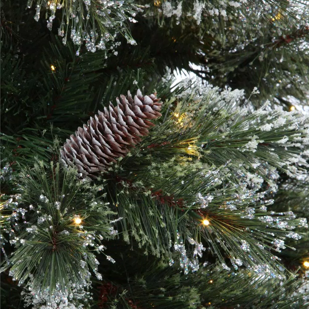 - Outfitted with 1,197 artificial Sparkling Amelia Pine branch tips decorated with a combination of snow, ice, glitter and pinecones