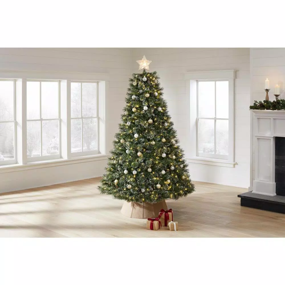 Your holiday display will shine with this 7.5-ft. sparkling Amelia pine artificial Christmas tree. Highlighted by snow, ice, glitter and pinecones, it boasts 1,197 decorated branch tips that offer a full appearance. The tree is pre-lit with 600 SureBright warm white micro dot LED lights that add an elegant presence to your home. This glimmering Christmas staple is easy to set up and lights with a single plug thanks to Quick-Set technology keeping the light strings within the trunk. To achieve a full look, you will need to shape, or fluff, the branches. Fluffing a tree of this size may initially take up to two hours, but the results are well worth the time and effort. The base measures 54 in. around when fully shaped.