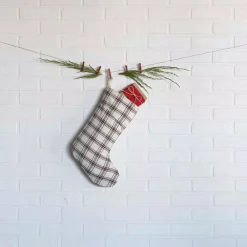 VHC Brands 15 In. 100% Cotton Amory Ivory White Farmhouse Christmas Decor Plaid Stocking