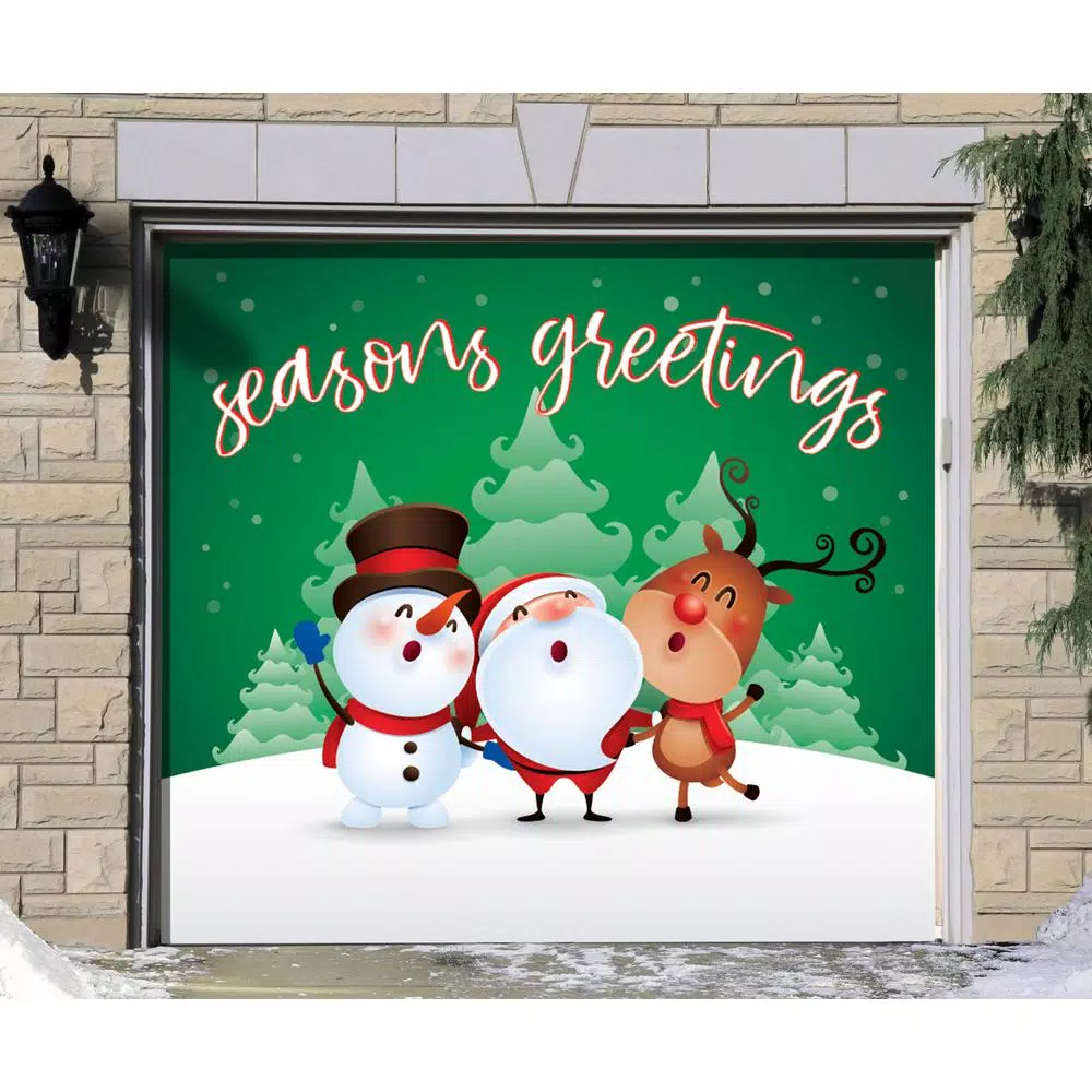 Christmas Garage Door Banner Mural Sign Decor 7 ft. x 8 ft. Car Garage, The Original Holiday Garage Door Banner Decor by My Door Decor, makers of My Door Decor. Proprietary components for easy assembly, allowing door to open and close without hurting the integrity of the door. Huge selection of holiday themes at My Door Decor. Garage Door Decor is manufactured to fit roll-up (sectional) paneled garage doors, as well as canopy (flat) garage doors. We’ve developed a system that makes installation quick and easy. This system requires no tape or screws, which could potentially damage your garage door. Instead, our hardware consists of a hook attachment that goes over the top of the garage door and a tension hook at the bottom. The top hook attachment protects your mural from theft by keeping it securely held behind the frame of the garage door. The tension hook keeps the mural taut when the garage door is closed and protects it from wind damage by flexing with the mural. Each garage door banner is ready to hang with minimal assembly. 2-people installing a single mural should take about 10-minutes. Every banner, whether it’s for your front door or garage door, comes with assembly hardware so it can be installed right out of the box.