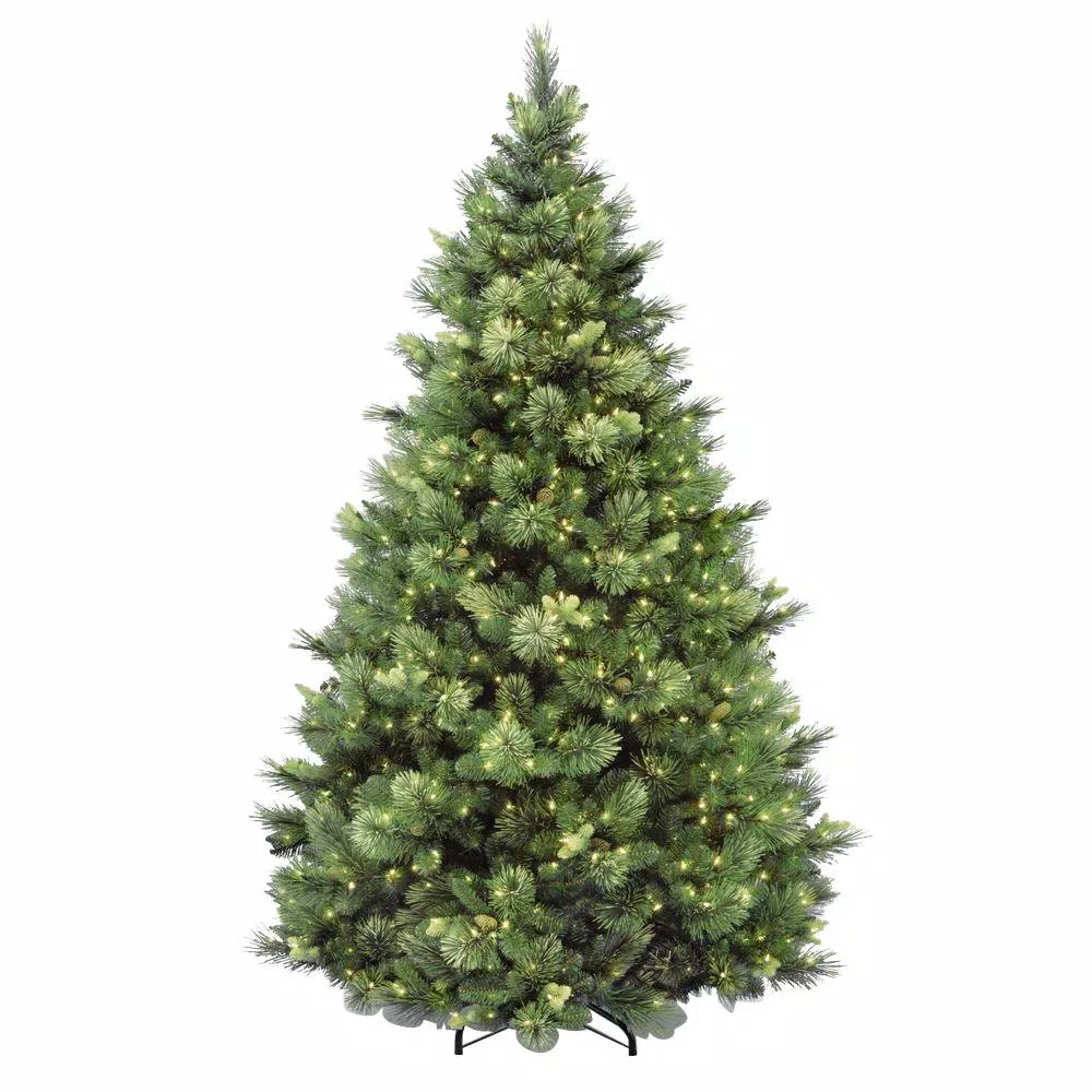 This Carolina Pine tree features mixed bristle and cashmere branch tips and is trimmed with flocked pine cones. It is pre-strung with 750 clear lights that remain lit even if a bulb burns out. This three section tree features hinged branches for ease of assembly. Sturdy folding metal tree stand is included.