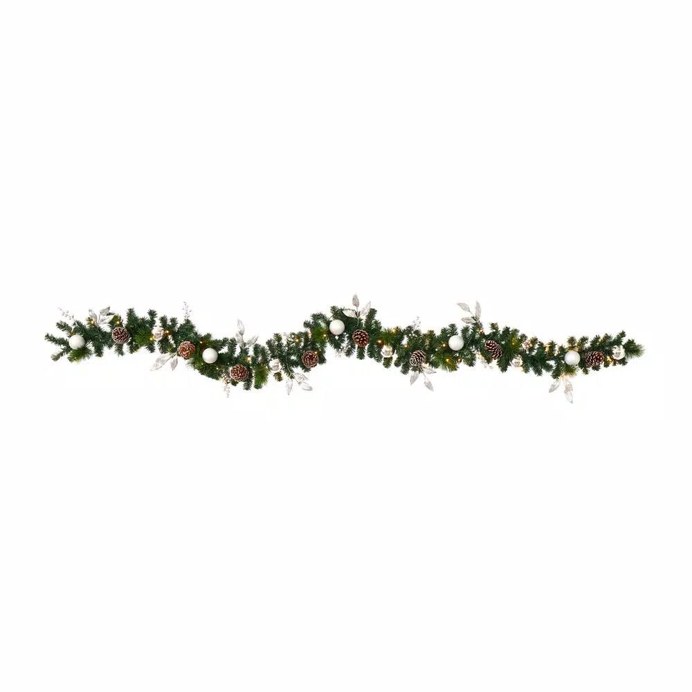 Complete your holiday decor scheme with this artificial winter garland, intricately designed from realistic looking pine foliage in a palette of seasonal evergreens and accented throughout with faux pinecones that look incredibly lifelike and decorative ornaments – all to help evoke the Christmas spirit. Arriving pre-strung with 50 clear LED lights (battery operated) to eliminate tangles, it will effortlessly illuminate any space it inhabits. Great for showcasing over a mantle, bare counter, or stair banister, this impressive 9 ft. L artificial garland will undoubtedly complete a traditional holiday setting for years to come. Silk plants are manufactured using synthetic materials, such as polyester material or plastic, and are well designed and constructed to be life-like in appearance. This item will need to be re-shaped when removed from the secure box to allow it to reach its fullest size. Your artificial plant will look beautiful for years to come; simply wipe clean with a soft dry cloth when needed.