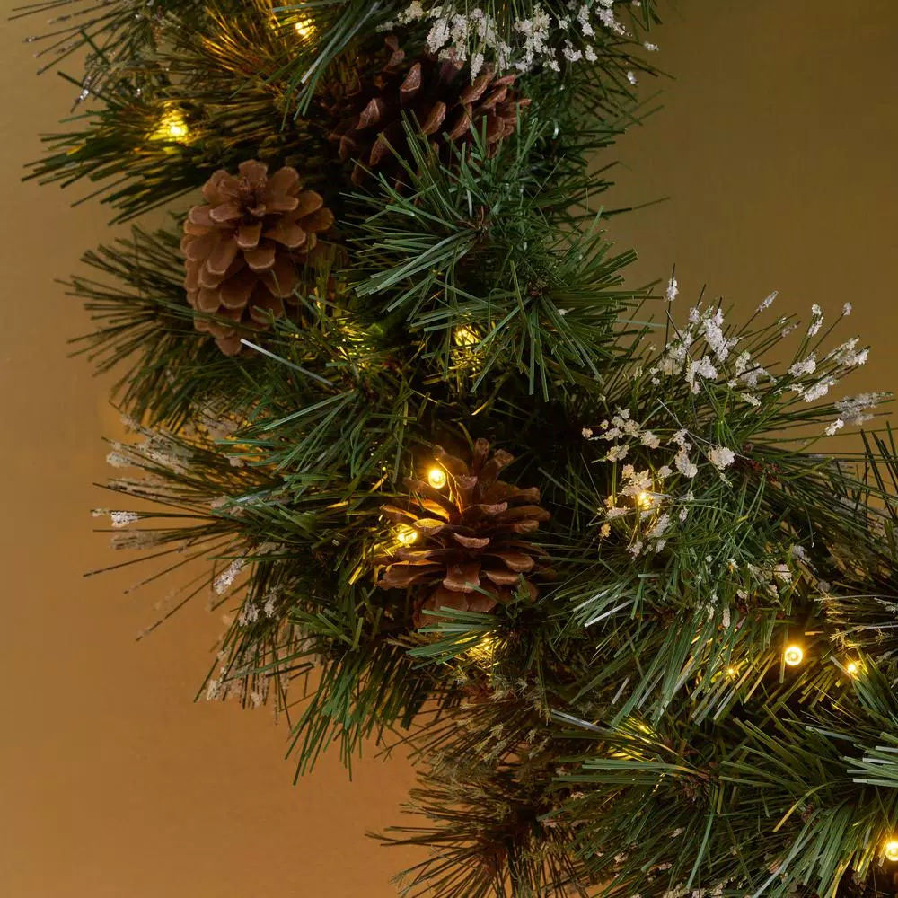 This beautiful 24 in. Cashmere Pine and Mixed Spruce wreath is a great way to add holiday flare to your front door this holiday season. It is pre-strung with 50 warm-white LED lights and features snowy branches and genuine pinecones, is battery-operated and comes complete with timer. Simply hang it on a mantel, front porch, or window to bring holiday cheer to your home.