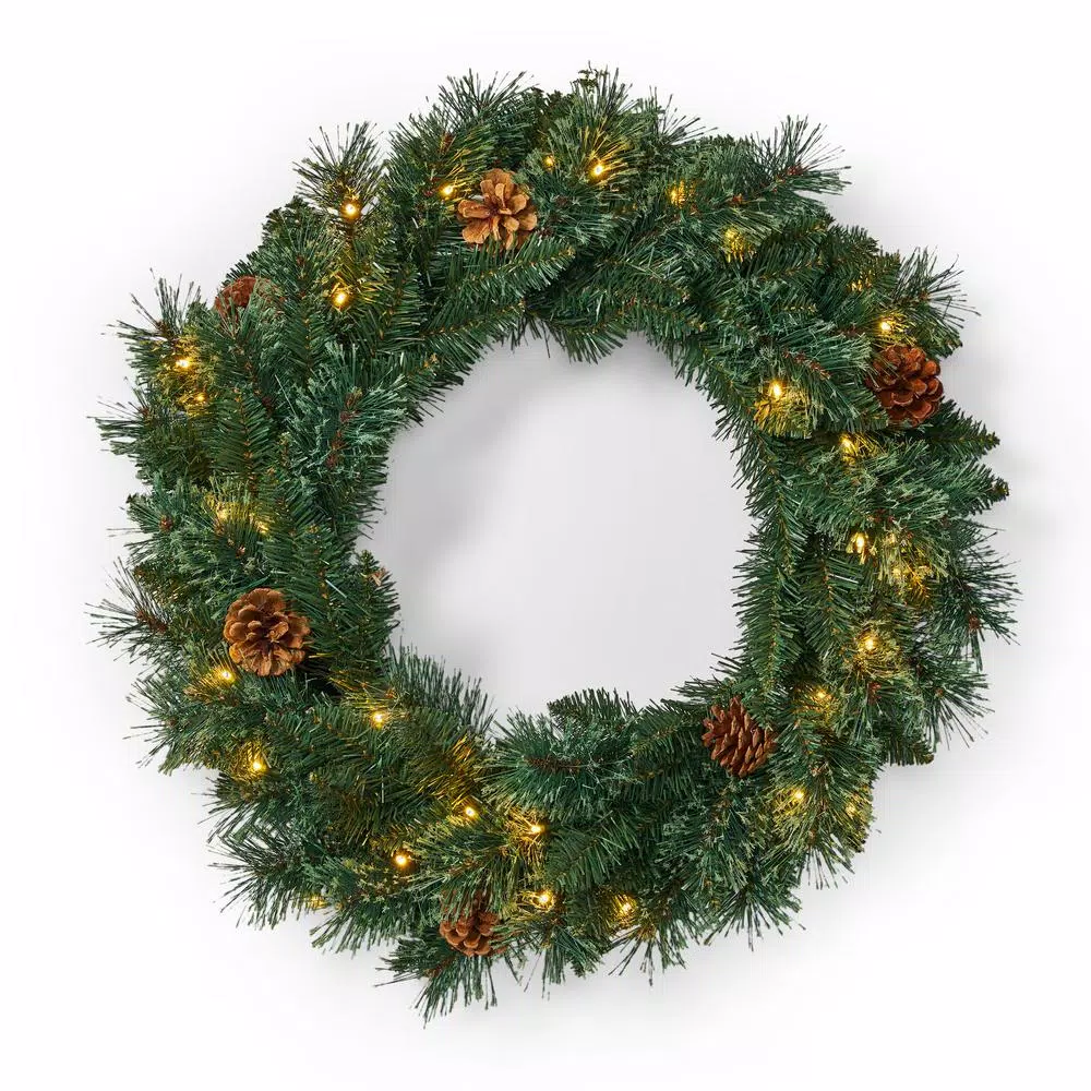 Let your Christmas spirit shine through this winter season with an accessory that embodies holiday cheer. Our Christmas wreath offers your home a splendid ring of deep green mixed pine needles, pine cones, and shimmering LED lights to complete the look. These lights come with a convenient battery box, creating the perfect decorative accessory for any blank space. Featuring a sturdy iron frame to keep its shape, this lovely wreath offers a beautiful classic arrangement that will bring holiday cheer to your home for years to come.