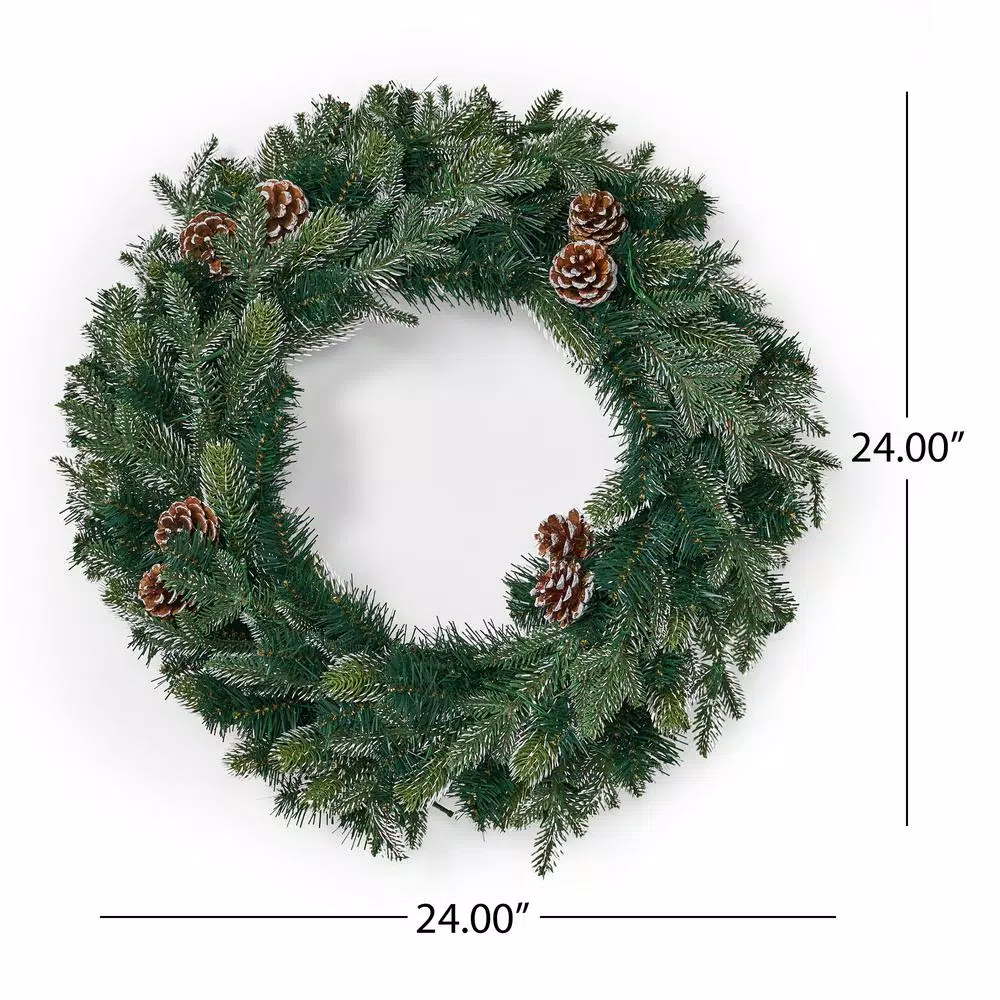 Greet the holidays with festive cheer by bringing some eye-catching decor for your home. Our Christmas wreath offers your home a splendid ring of deep green mixed spruce needles, pine cones, and shimmering LED lights to complete the look. These lights come with a convenient battery box, creating the perfect decorative accessory for any blank space. Featuring a sturdy iron frame to keep its shape, this lovely wreath offers a beautiful classic arrangement that will bring holiday cheer to your home for years to come.