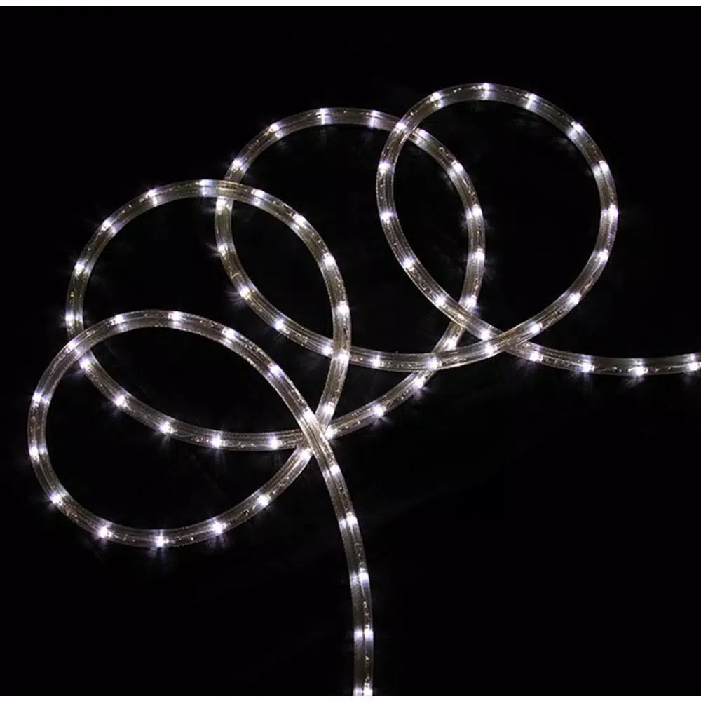 18 ft. Pure White LED Indoor/Outdoor Christmas Rope Lights – 2 in. Bulb Spacing. Light color: pure white. Tube color: clear. Spacing between each bulb: 2 in. Lighted length: 18 ft. Total length: 20 ft. Approximate thickness: 0.5 in. Dia (13 mm). Wire gauge: 18. LED lights use up to 80% less energy. Super bright vibrant bulbs. Bulbs stay cool to the touch. End to end connectors allow you to connect multiple sets of these rope lights together (210-Watt maximum). Includes mounting clips and screws for easy placement. UL listed for indoor/outdoor use.