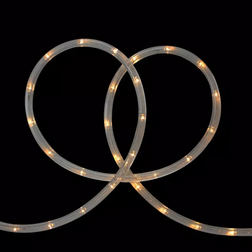 Rope lights are the perfect choice for decorating your backyard patio or garden for the upcoming warm weather. The flexible tube allows you to wrap the lights around trees decks or patios. These bright LED lights can also be used to illuminate your pathway a bookcase or cabinet in a fun way. The water-resistant feature allows you to place these lights around your pool and not have to worry about the splash zone. The possibilities are endless with these rope lights. Product Features: Tube color: clear. Bulb color: warm white. Warm white also known as warm clear has a soft natural incandescent glow similar to candlelight. Spacing between each bulb: 2 in. Lighted length: 18 ft. Approximate thickness: 0.5 in. Dia. 17 in. white lead cord. Additional Product Features: Super bright bulbs. Water resistant. End connectors with the same opening of 0.5 in. allow you to connect multiple sets together (not to exceed 210-Watt). UL listed for indoor or outdoor use. Flexible and easy to install. Includes mounting clips zip-ties and screws.