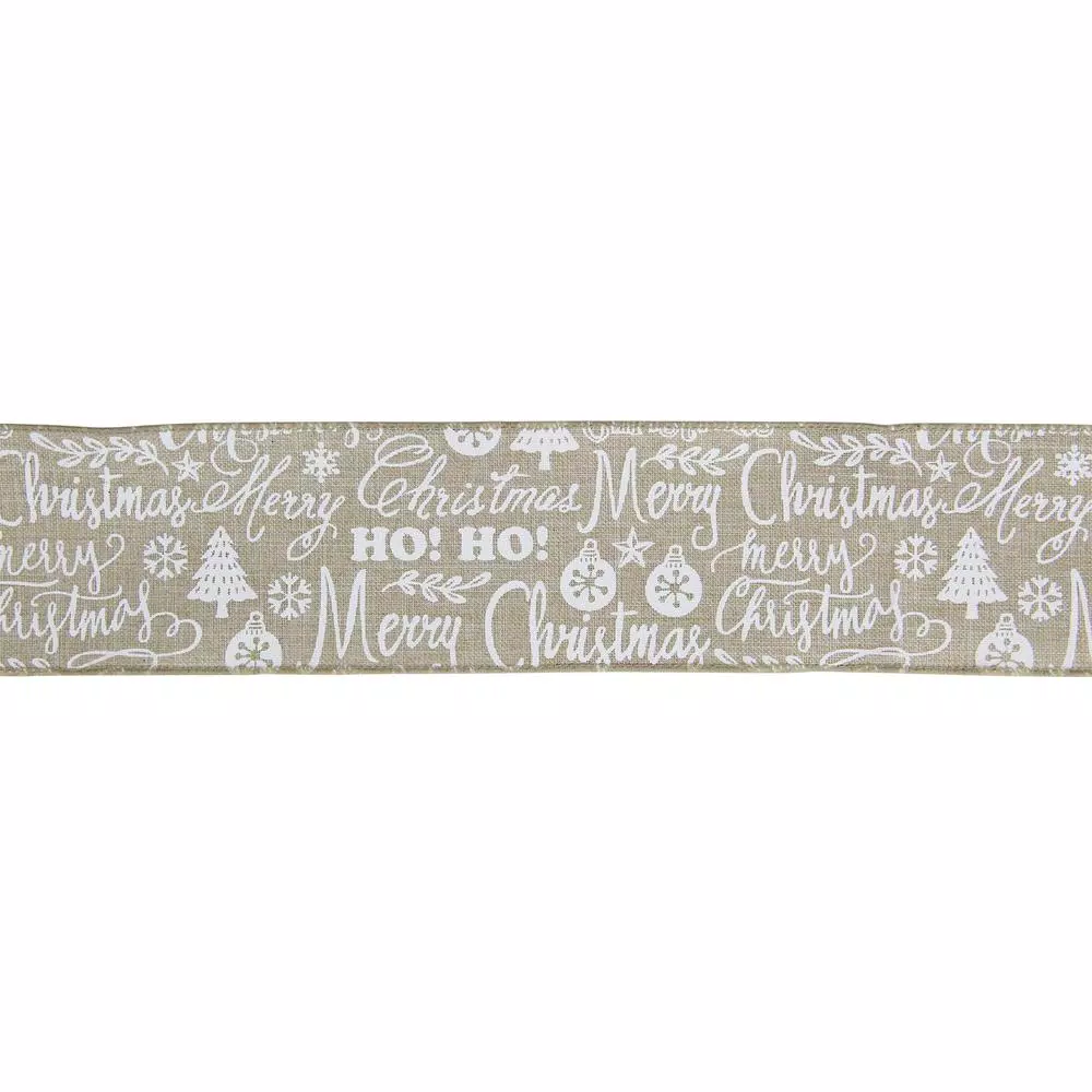 This gorgeous beige Merry Christmas burlap style ribbon with white designs and lettering is great for decorating your gifts and home for the holiday season. The wired ribbon will help everyday designs maintain their shape and beauty. Whether youβre a florist an event planner or crafter wired edge ribbon is a dream to work with. Add this ribbon to your Christmas tree wreaths mantles or stairway for beauty and glamour. Features: Design includes the colors beige and white. Ribbon has Merry Christmas and HO HO written on it. Sewn wire edged ribbon allows you to bend and shape your creations to decorate with ease. Ribbon comes on (1) spools. Perfect for holiday decor. Dimensions of each spool: 2.5 in. W x 16 yds. in length. Material(s): polyester/burlap.