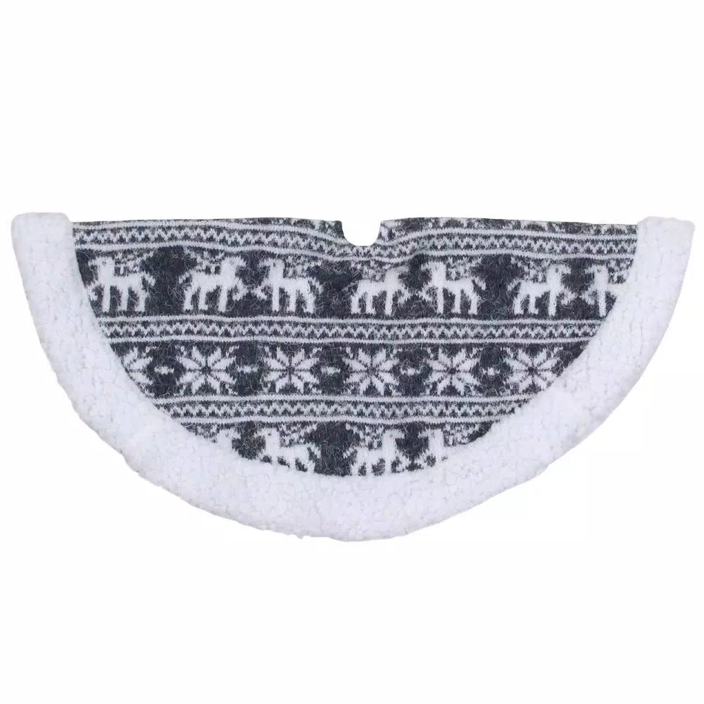 Celebrate a country Christmas with family and friends this year. Add some rustic charm to your holiday decor with this knitted mini tree skirt. This skirt features a striped design with reindeers and snowflakes with white faux fur trim. Great for all kinds of holiday decorations including tree trimming mantle displays tabletops centerpieces and more. Product Features: Gray and white Christmas tree skirt. Features a reindeer and snowflake lodge design. This tree skirt has a knitting pattern. Trimmed in cream Sherpa with a mesh lining. Contains 2 hook and loop fastener fasteners for stability under your Christmas tree. Tree skirt is circular in shape. Recommended for indoor use only. Dimensions: 20 in. Dia. Material(s): polyester.