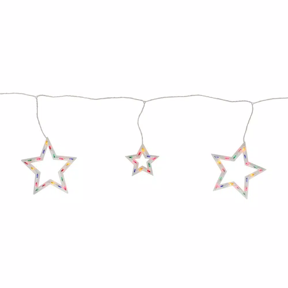 These star shaped icicle lights are a unique way to decorate the outside of your house for the holiday season. These lights feature alternating lengths to keep the eye interested. Add these lights solo to the eves of your house or complete a whole outside light show. Product Features: Color: multi-color bulbs/white wire. Multi-color consists of red green blue pink and yellow bulbs. Number of bulbs on string: 100. Bulb size: mini. 4 large stars and 2 small stars. Drop lengths alternate between 12 in. and 17 in. L. Spacing between each drop: 18 in. Lighted length: 7 ft. Total length: 8.5 ft. 6 in. lead cord. 6 in. tail cord. Additional Product Features: Super bright bulbs. UL certified and approved for indoor or outdoor use. If 1-bulb burns out the rest will stay lit. Comes with replacement bulbs flasher bulbs and spare fuses. Contains 1 plug with end connector which allows you to stack multiple sets together (not to exceed 210-Watt). Wire gauge: 22. Large star dimensions: 9.5 in. H x 10 in. W. Small star dimensions: 5.5 in. H x 5.5 in. W.