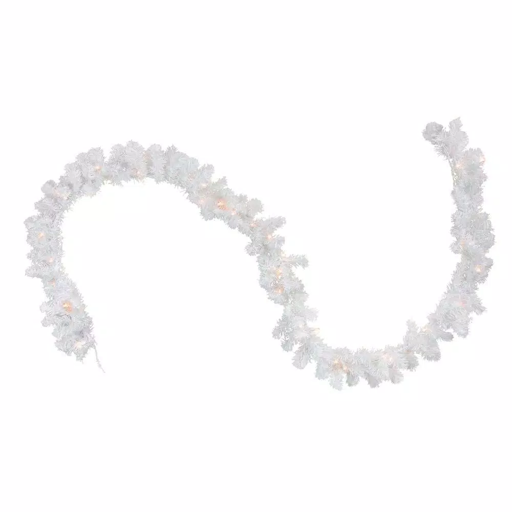 This garland would be a perfect accent on your mantelpiece or along a railing. It’s clear lights it will emit a warm glow over your holiday decor. A perfect accent for a door or wall to add a bit of dimension and holiday cheer. Product Features: Pre-lit with 50 clear mini lights. 200 tips. 1.75 in. W tapered tips. 30 in. white lead cord. Additional Product Features: Super bright bulbs. Recommended for indoor use only. If 1-bulb burns out the rest will stay lit. Bendable wire center allows for you to shape the garland any way you desire. Metal hooks on each end for easy hanging. Flame retardant. UL listed for indoor or outdoor use. Contains end-to-end connectors allows you to connect multiple garlands together (not to exceed 210-Watt). Comes with replacement bulbs and spare fuse. Wire gauge: 22. 120-Volt 60 hz 0.17 Amp 20.4-Watt. Dimensions: 9 ft. L x 12 in. W. Material(s): PVC/glass bulbs/wire/metal.