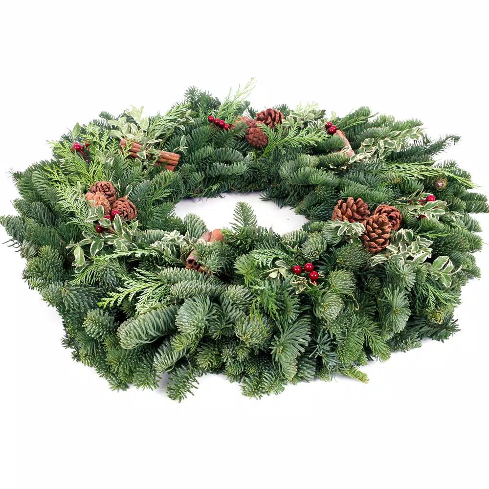 - Fragrant Noble Fir, Western Red Dedar and variegated Oregonia, 3 bundles of cinnamon sticks, 6 red berry clusters and three triple clusters of Ponderosa cones