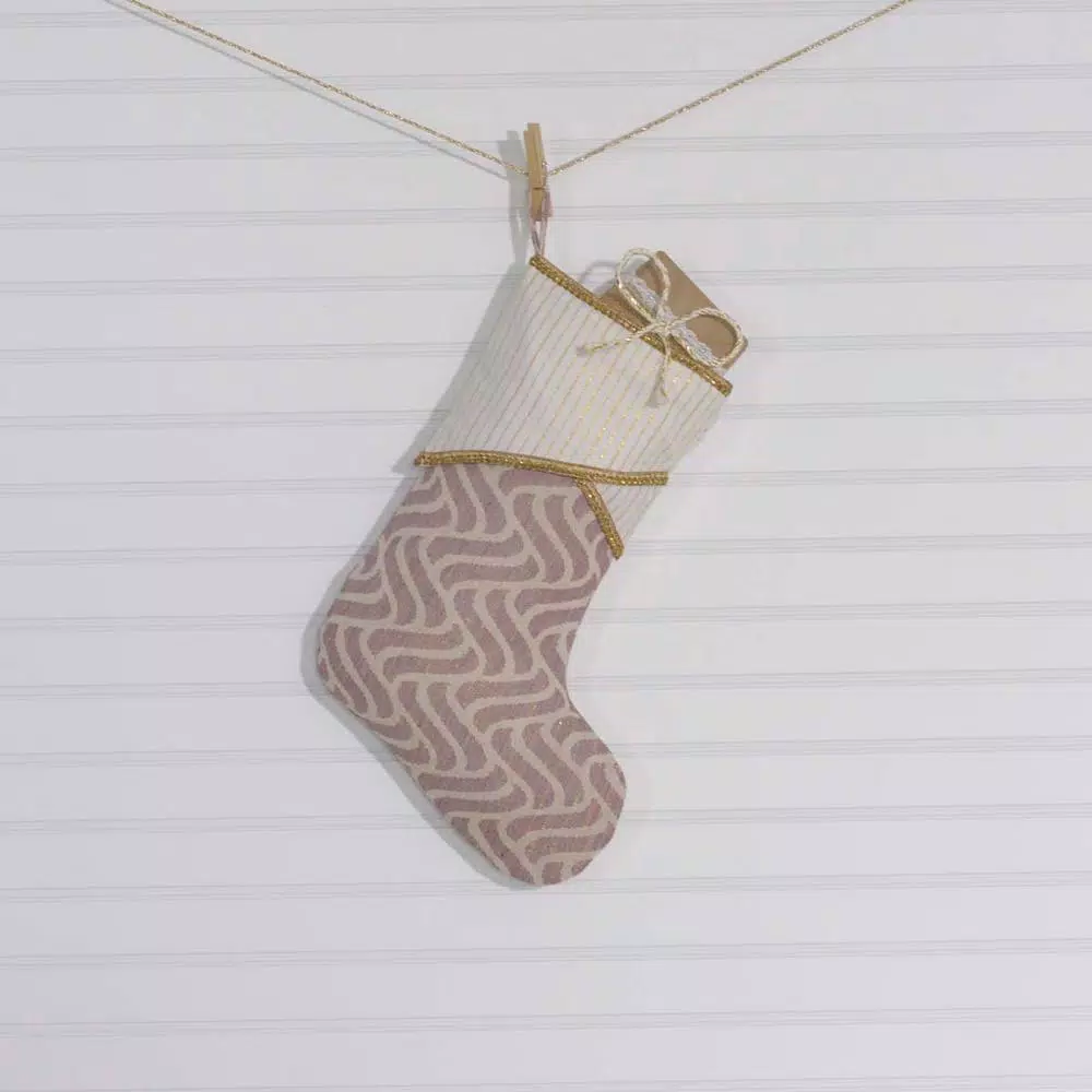 Go for a glamorous look on Christmas morning with the Magdalene Stocking. Lined in taffeta for durability, the stocking features an elegant jacquard pattern in mauve and antique white. Accents of metallic gold thread and bronze trim adorn the double layered cuff.