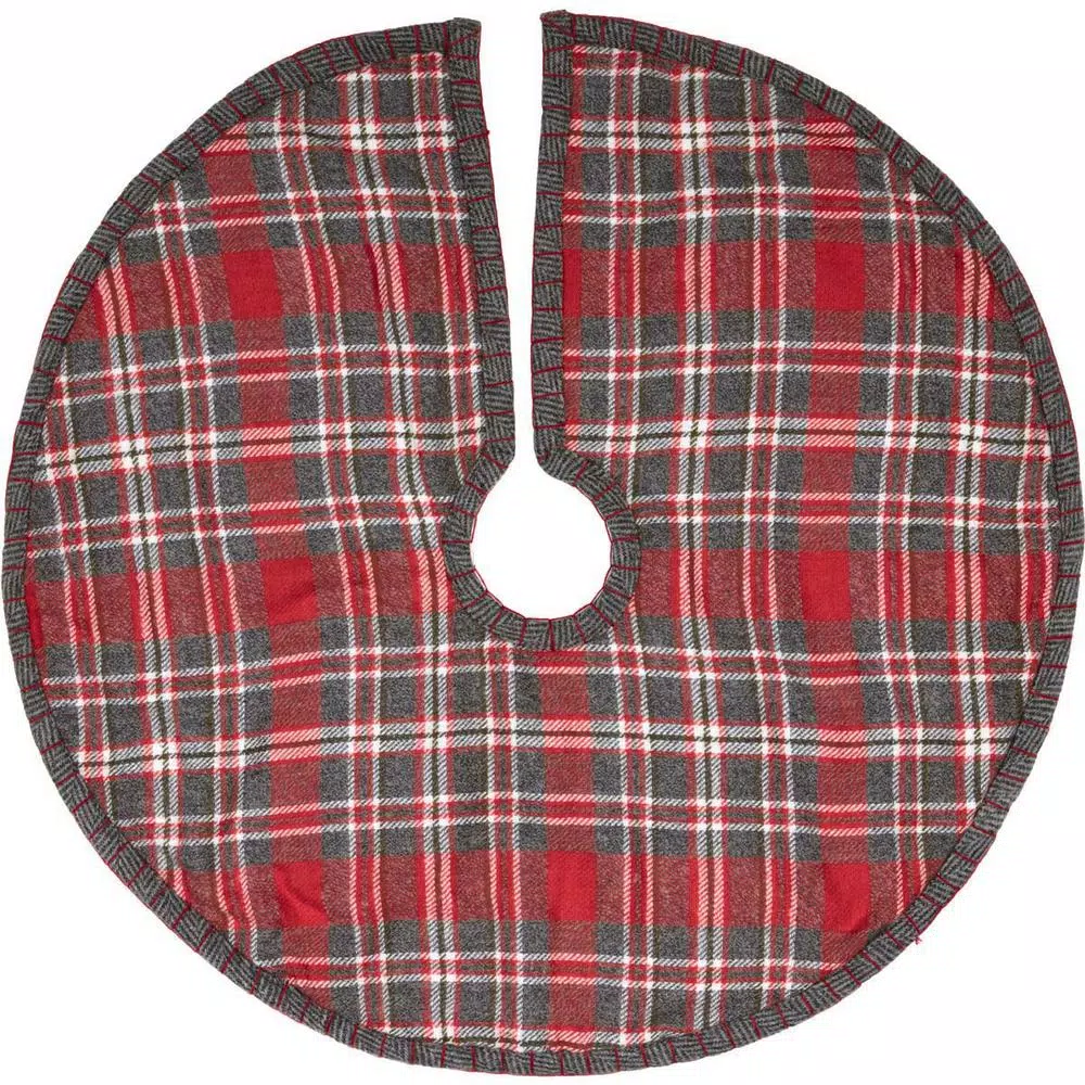 Bring the tasteful holiday rustic look of the Anderson Plaid Mini Tree Skirt home this year. It all comes together in a classy cherry red, iron grey, and marshmallow textured woven plaid, for a timeless addition to your Christmas decor. The skirt is finished with a turned edge seam with cherry red whip stitching. Reverses to 2-tone grey herringbone weave felt.