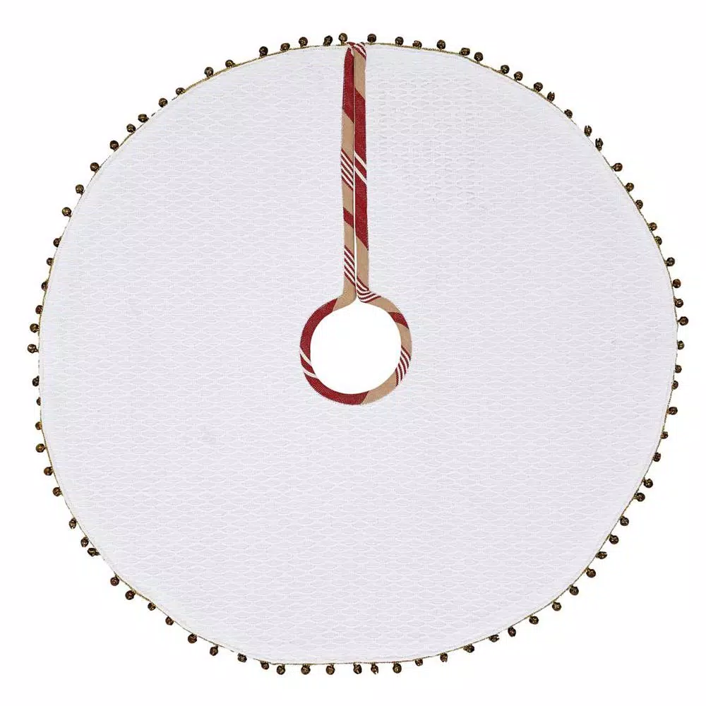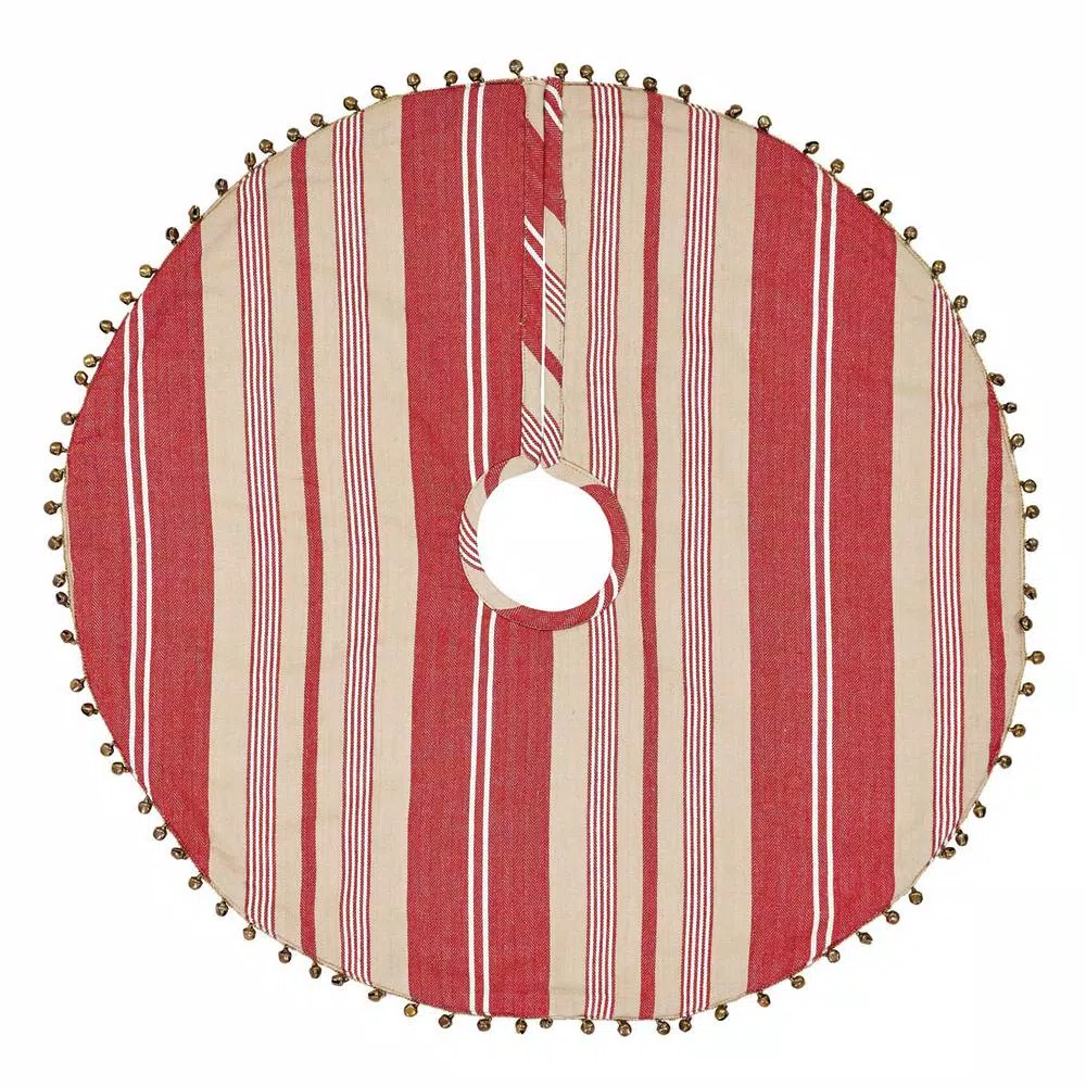 Invite the Vintage Stripe Mini Tree Skirt into your home this year with its festive candy apple red, khaki, and snow white adornment. As a special touch, the skirt’s outside trim features real jingle bells. Reverses to snow white woven cotton.