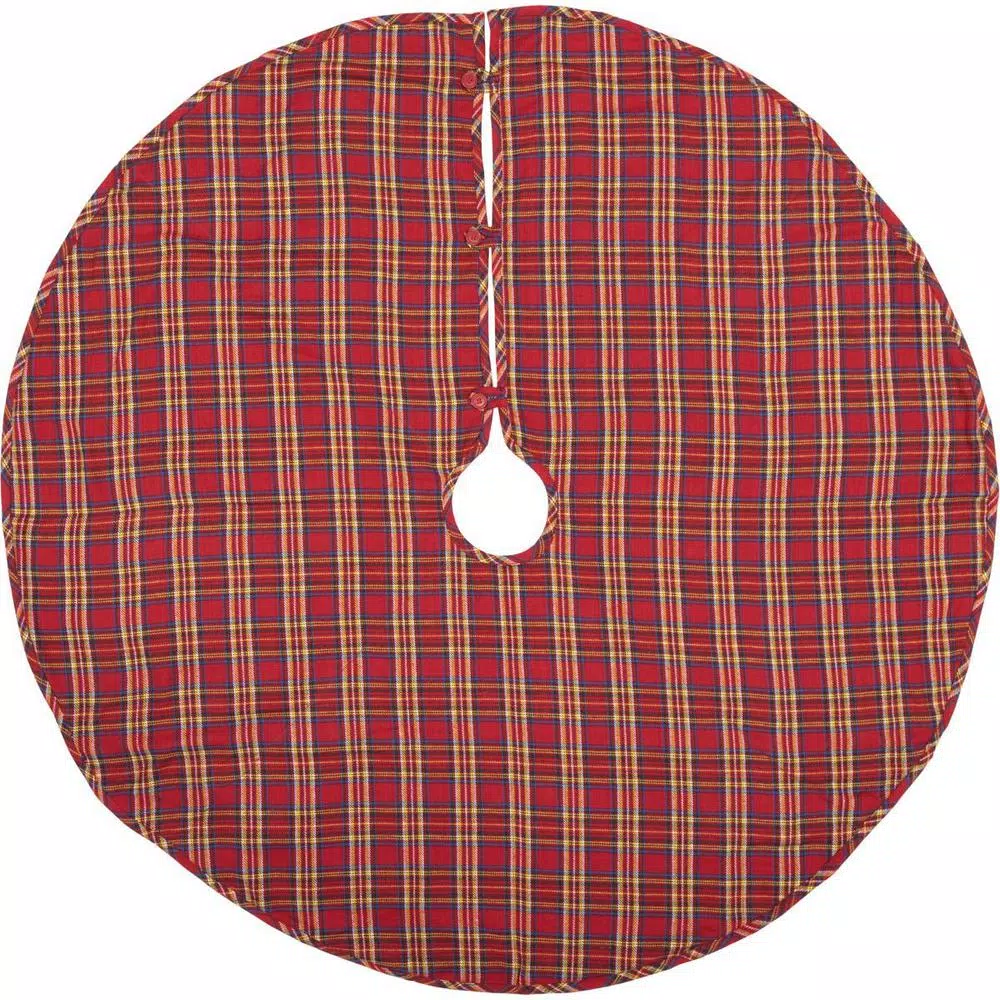 Invite upstate lodge into your home this Christmas with the Galway Tree Skirt. The Galway skirt is a barn red-base plaid with accents of cool blue, lemon meringue, black and creme for a timeless holiday look. Features 3 red button closures and loops. Reverses to same as the front.