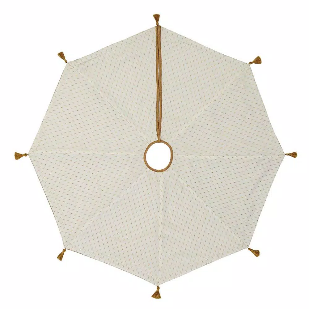 The Tinsel Tree Skirt 48 in. is a glitzy and fun look for Christmas. Features a shimmery gold tulle (fine netting) overlaid on antique white cotton and lined in flannel. Woven with shimmery gold thread pattern filling the octagon shape and accented with gold tassels on each corner, the skirt is sure to be a favorite. Includes 3 button closures and reverses to antique white cotton woven with a shimmery gold thread pattern.