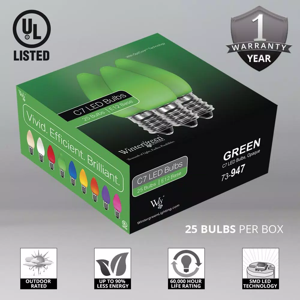 - Box of 25 C7 green smooth/opaque OptiCore LED Christmas light bulbs, E12 (candelabra) base; fits any standard C7/E12 sized stringer socket