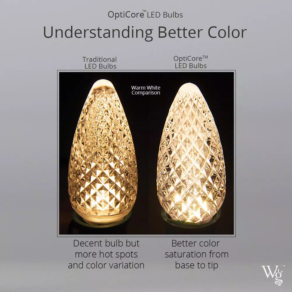 OptiCore smooth Christmas light bulbs re-create the rich color and warm beauty of incandescent vintage Christmas lights, but with all the advantages of LED. The opaque lens is 115% thicker than ordinary bulbs and made of polycarbonate, up to 200 times stronger than glass. This makes OptiCore bulbs virtually unbreakable. The SMD LED diode inside the bulb saturates the lens evenly with vibrant light, giving these bulbs that old-fashioned glow from any viewing angle. And with an average lifespan of 60,000-hours, these are bulbs that will last for years. Get the energy efficiency and durability of LED with all the richness and color of old-fashioned Christmas lights in these OptiCore LED smooth/opaque Christmas light bulbs.