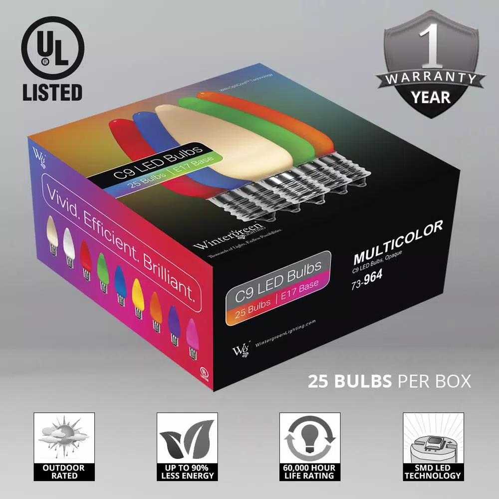 - Box of 25 C9 multi-color smooth/opaque OptiCore LED Christmas light bulbs, E17 base; fits any standard C9/E17 stringer socket